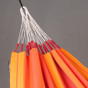 Die Hängematte wird in Kolumbien aus reiner und hochwertiger Baumwolle gefertigt. Sie hat eine große Anzahl an Aufhängeschnüren und sorgt damit für die optimale Gewichtsverteilung und optimalen Liegekomfort.