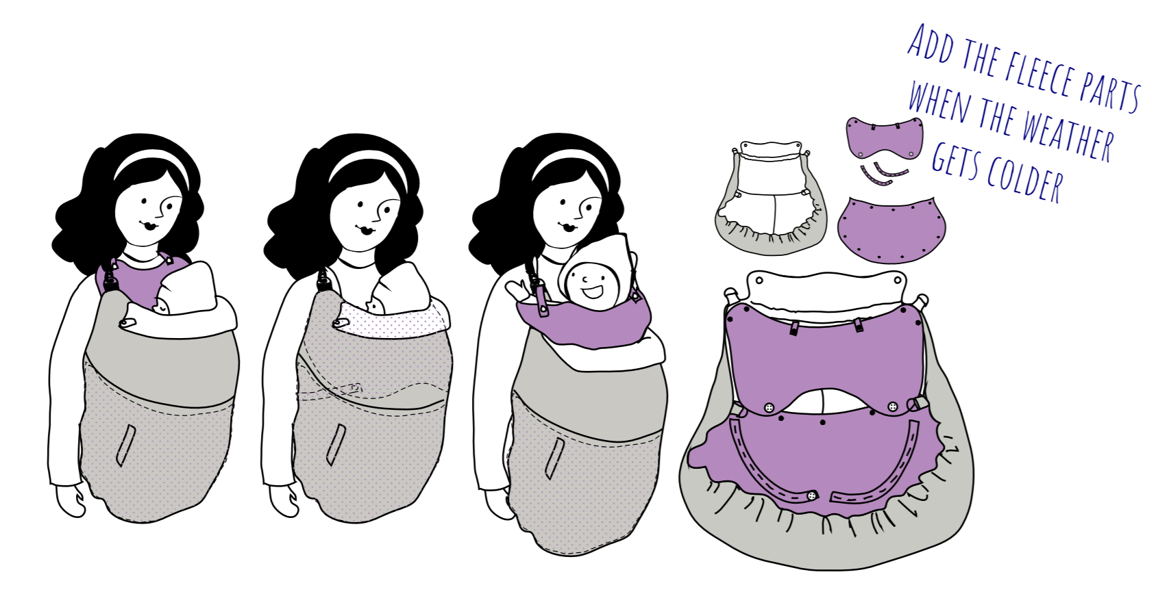 Das Tragecover ersetzt keine Babytrage, sondern dient als Wetterschutz über einer Tragehilfe oder einem Tragetuch.